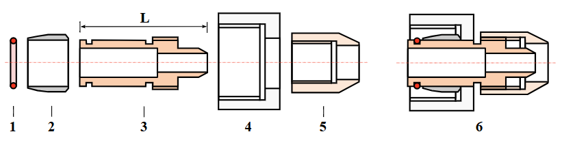 This type of adapter each consists of O-ring (1), adapter sleeve (3) and hose nut (5). The cutting ring (2) and nut (4) are parts of commercial cutting ring fittings. Prior to assembly (6) the O-ring is to be removed, and after assembly it is to be put back.