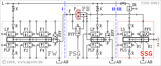 • Secondary-Circuits Rinsinggroup SSG (segment III):B1 = rinsing block, B2 = switching block, LS = secondary circuit solvent, PLS = secondary circuit pulsing air, FFS = secondary circuit laquer enable.