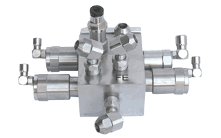 The rinsing block in standard execution has two pneumatically controllable 2/2-ways valves and two checkvalves. As rinsing block alternatively installable types:
